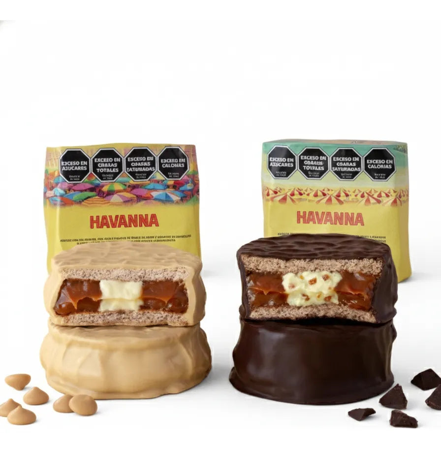 Un sofisticado alfajor cubierto de Chocolate Dorado Havanna, con suaves notas caramelizadas, relleno del inconfundible dulce de leche de la marca y con un cremoso centro de ganache de chocolate blanco. Una experiencia refinada y placentera con un toque moderno.